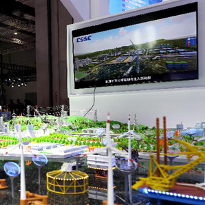 6月11日,参观者在一个清洁能源综合系统解决方案沙盘模型前驻足观看。
