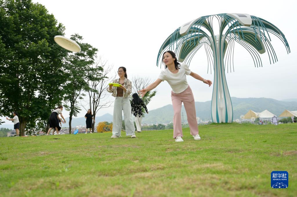 6月5日,在浙江省湖州市安吉县天荒坪镇余村乡村图书馆前,年轻人在草坪上玩飞盘。