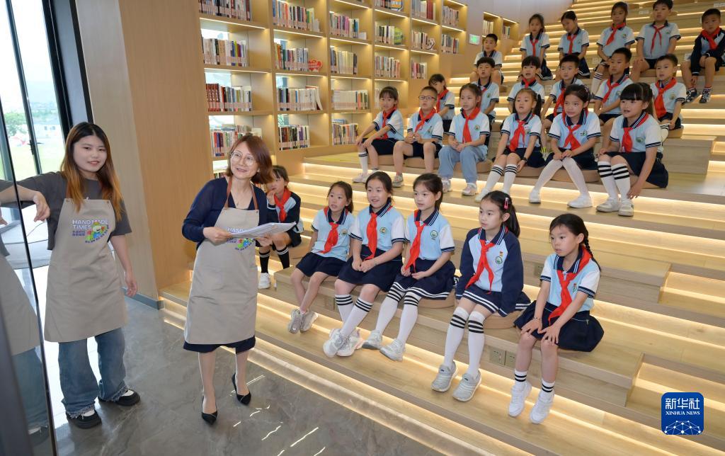 6月5日,在浙江省湖州市安吉县天荒坪镇余村乡村图书馆里,前来研学的安吉县天荒坪小学学生在听课。