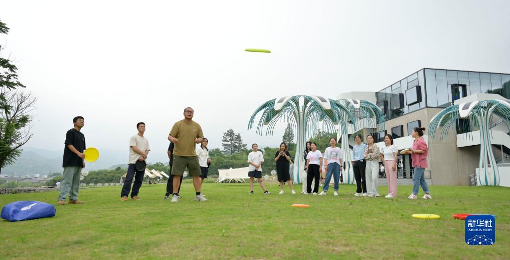 6月5日,在浙江省湖州市安吉县天荒坪镇余村乡村图书馆前,年轻人在草坪上玩飞盘。