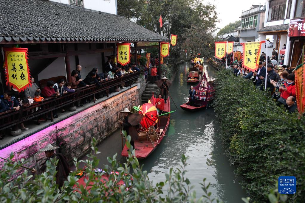 游客在浙江湖州南浔区和孚镇荻港村观看“水上晒秋”丰收庆典(2020年11月15日摄)。