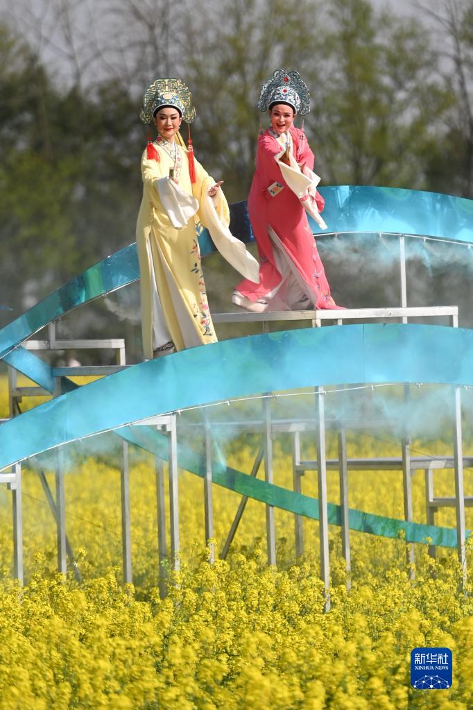 越剧演员在浙江桐庐梅蓉村油菜花田里的舞台上表演(3月26日摄)。