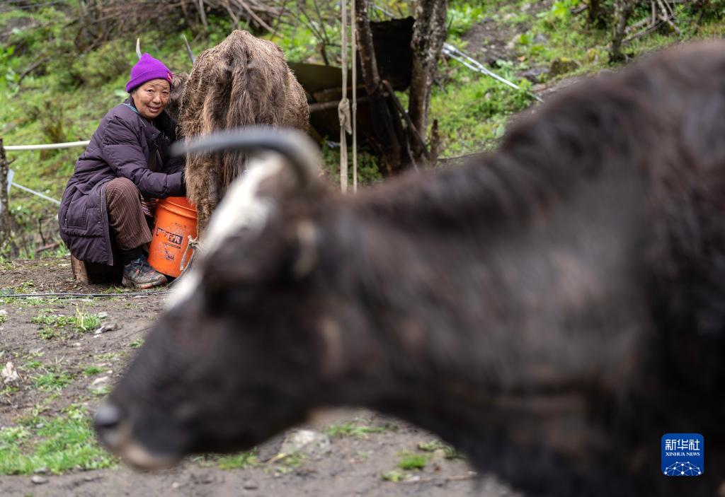 6月10日,央宗在牧场挤奶。