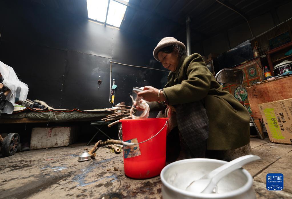 6月10日,卓嘎在牧场小屋中清洗制作酥油的工具。