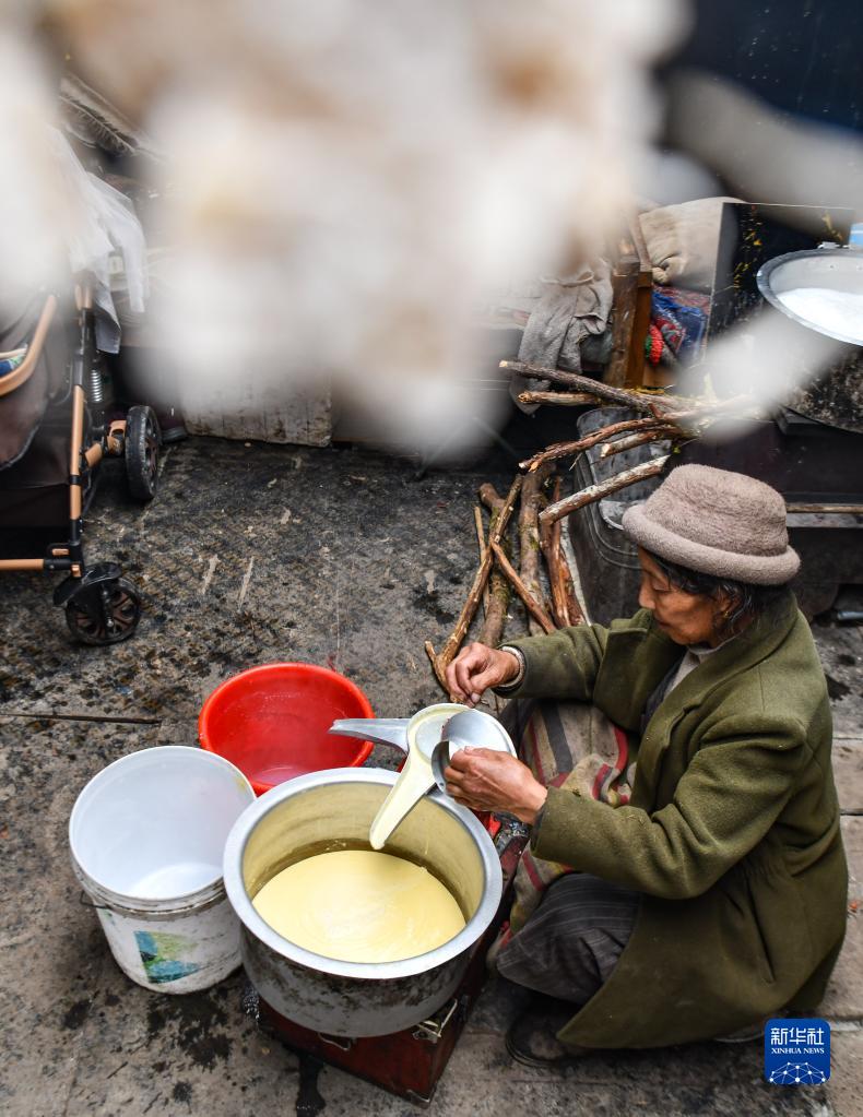 卓嘎在牧场的小屋里制作酥油(6月10日摄)。