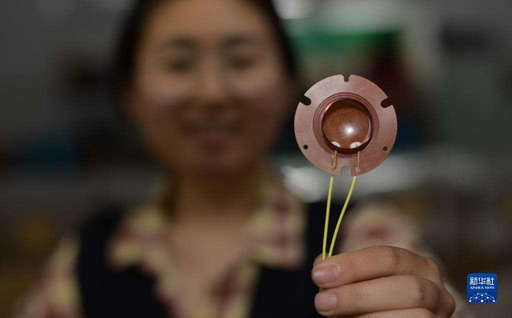 6月12日,工人在凤冈县一扬声器生产企业展示组装好的音圈。