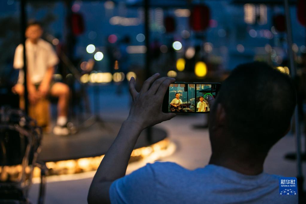 6月9日,在重庆市南岸区,游客在重庆开埠遗址公园的观景平台上欣赏音乐表演。
