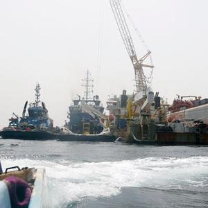 这是6月12日在也门荷台达附近海域拍摄的“萨菲尔”号油轮和联合国工程船。