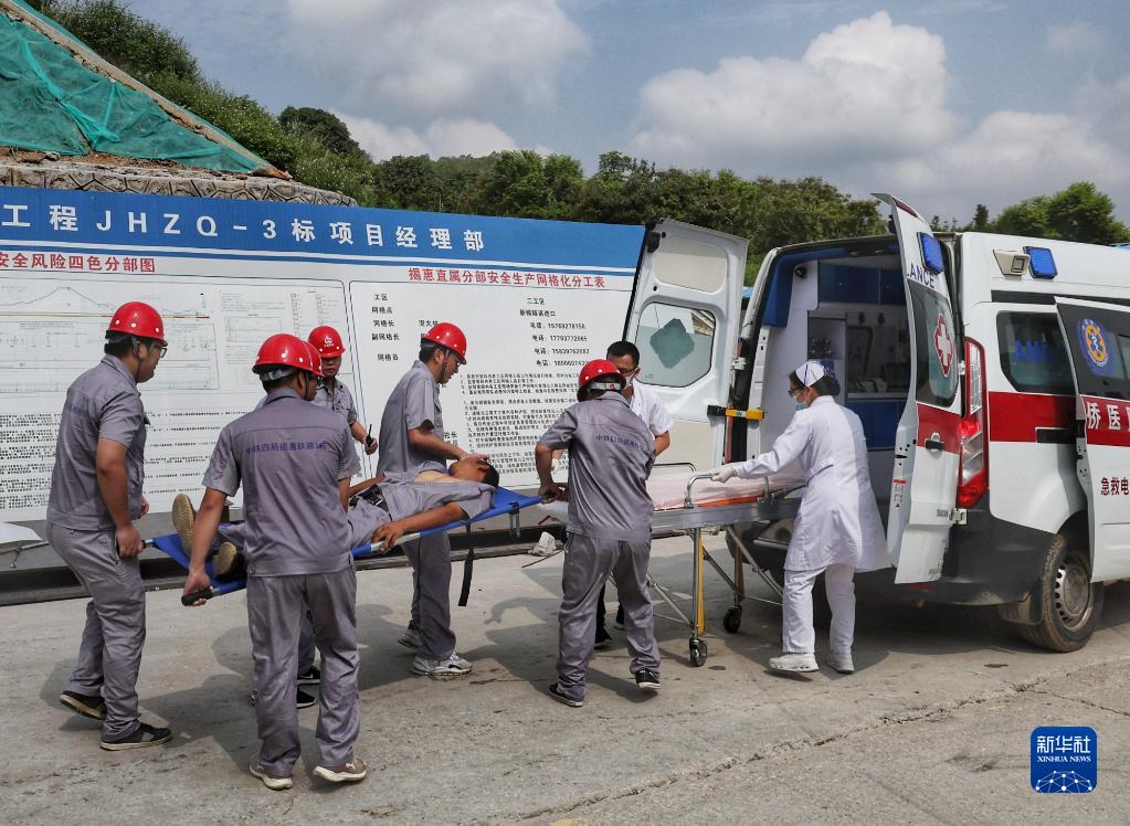 6月13日,中铁四局应急救援队演练将“受困人员”从隧道坍塌现场救援至安全区域并送医抢救。
