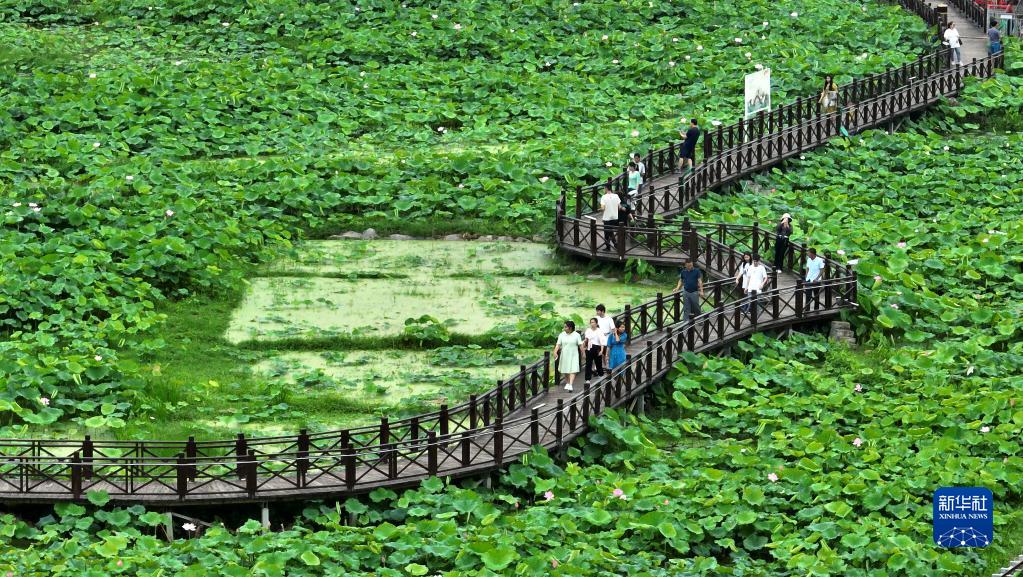 6月13日,游客在柳州市柳江区百朋镇万亩荷塘里游览(无人机照片)。