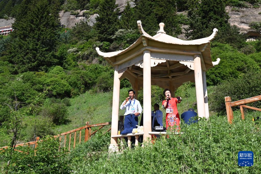 6月13日,在和政县松鸣岩景区,花儿爱好者演唱花儿。