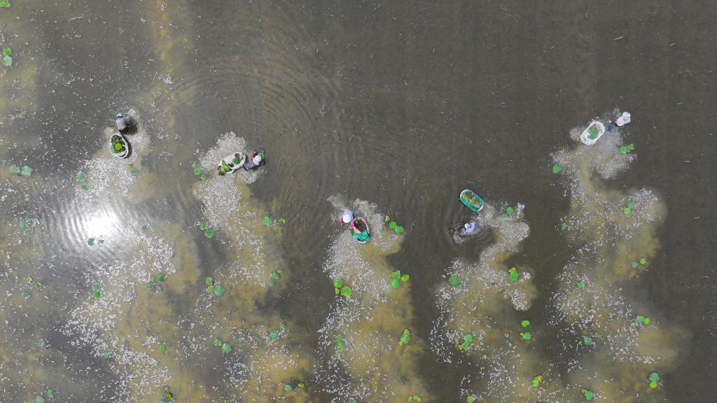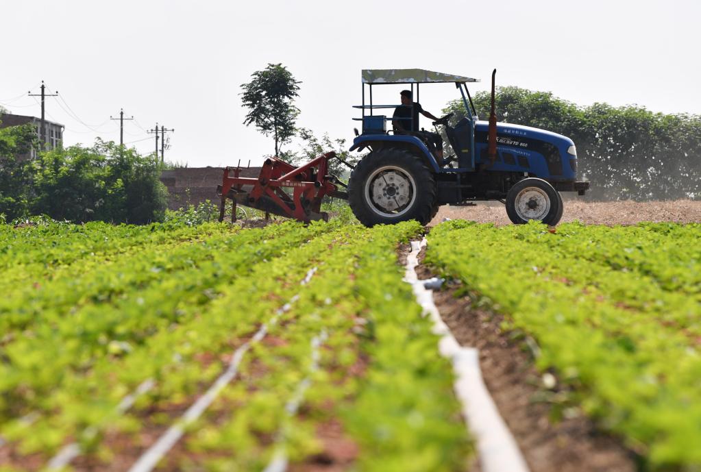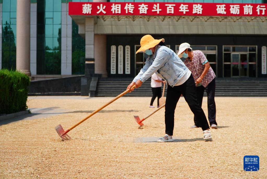 6月13日,农户在临邑县临盘街道政府大院晒粮。