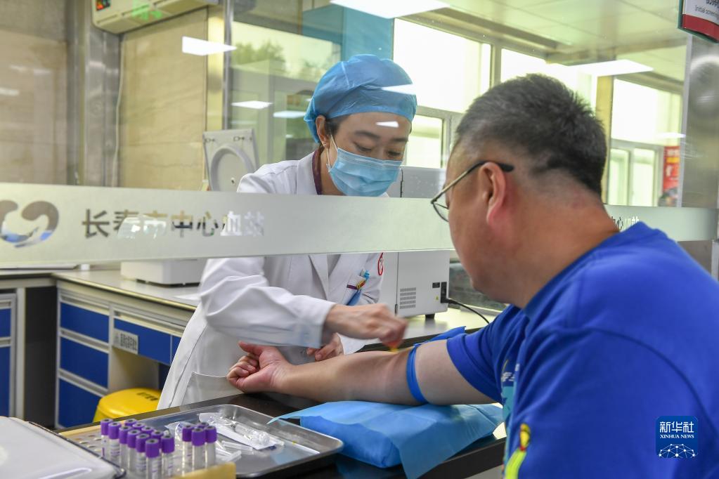 6月13日,在长春市中心血站,RH阴性血无偿献血志愿者李扬帆(右)进行献血前的血液检测。