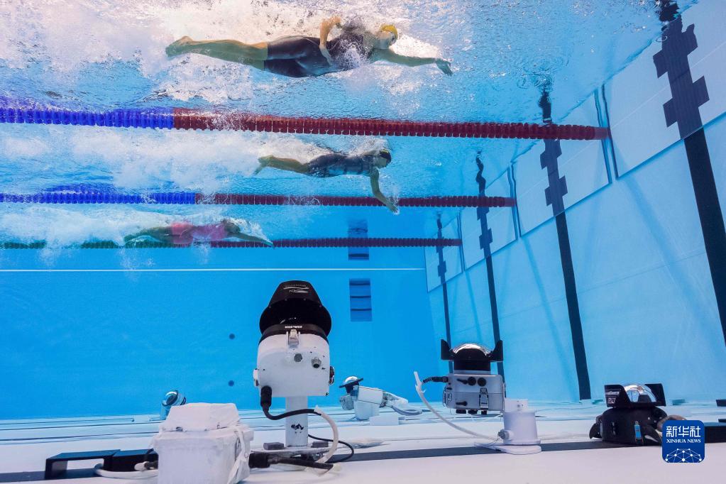 图为里约奥运会游泳比赛泳池底部安装的遥控相机在进行拍摄(2016年8月12日摄)。