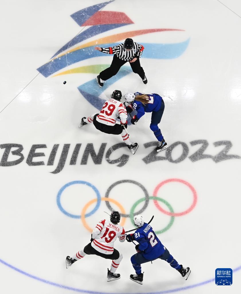 图为加拿大队和美国队队员在北京冬奥会女子冰球比赛中(2022年2月8日摄)。