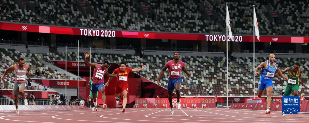 图为中国选手苏炳添(右四)在东京奥运会田径男子100米决赛中(2021年8月1日)。