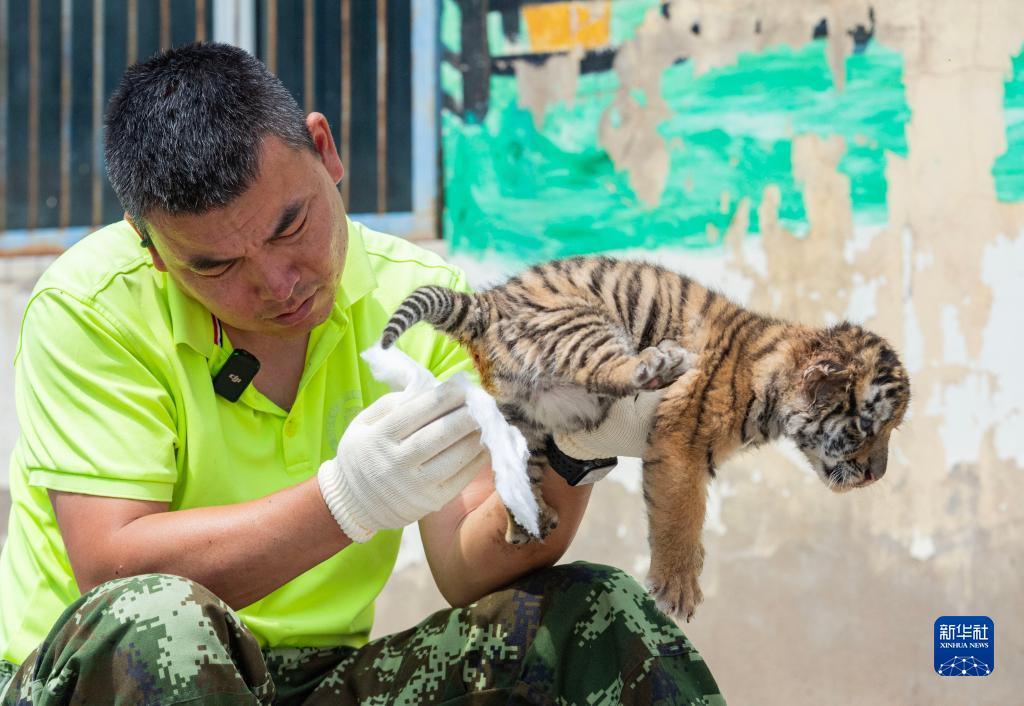 6月13日,在黑龙江东北虎林园,饲养员在清洁东北虎幼崽。