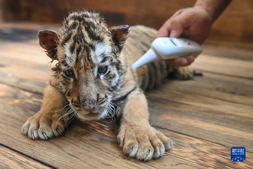 6月13日,在黑龙江东北虎林园的虎舍中,饲养员给东北虎幼崽测量体温。