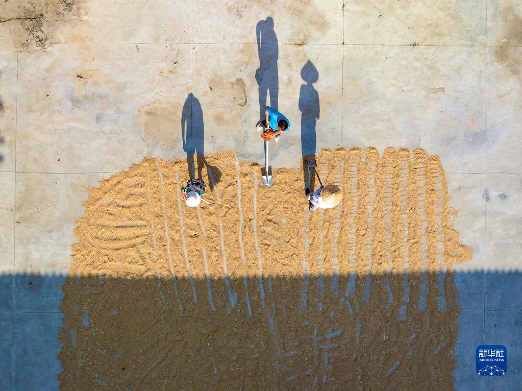 6月13日,在河南省安阳市汤阴县古贤镇支村党群服务中心临时晾晒点,村民在晾晒麦子(无人机照片)。