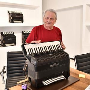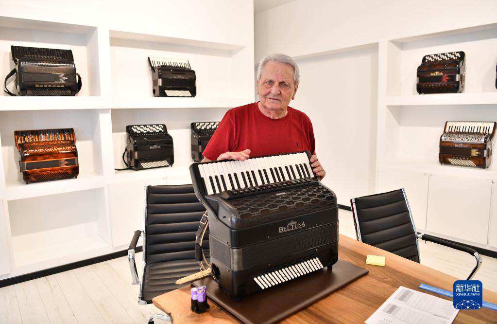 5月29日,在意大利卡斯特尔菲达多,贝尔杜纳品牌创始人阿纳尔多·门加希尼展示该品牌设计生产的一架超轻碳纤维材质手风琴。