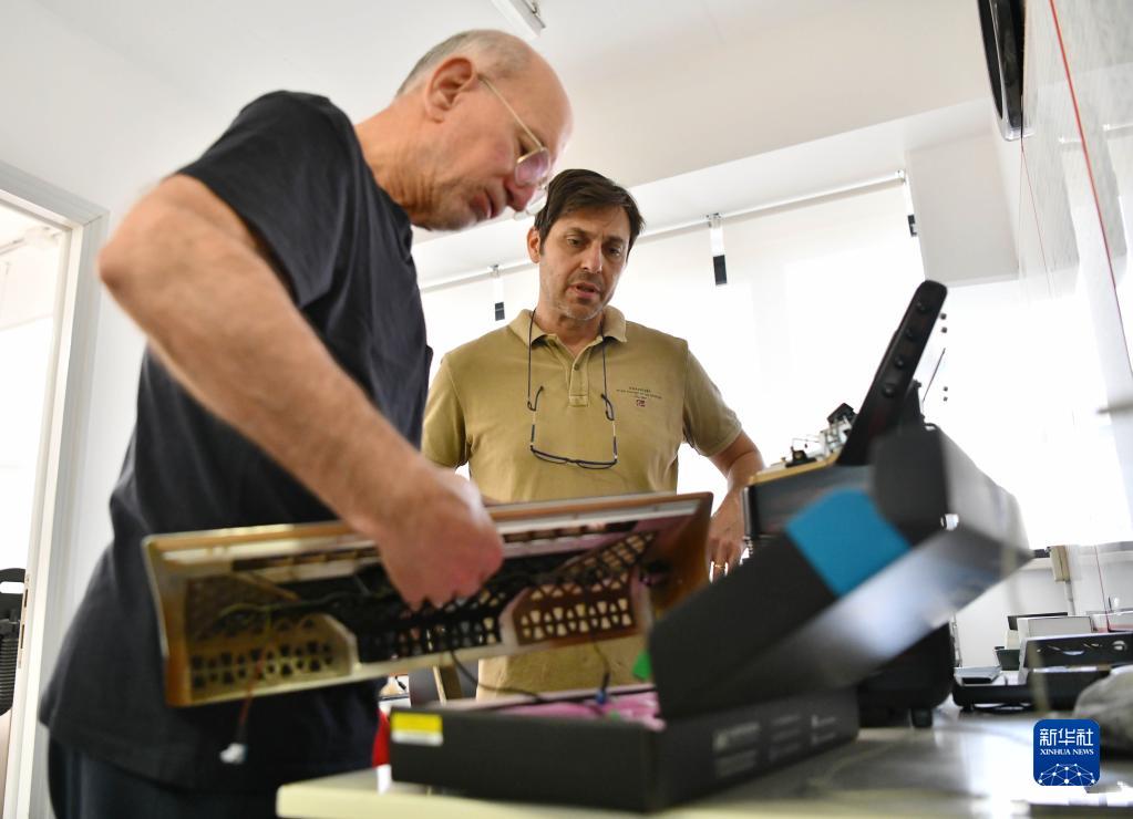 5月29日,在意大利卡斯特尔菲达多,贝尔杜纳品牌总经理弗朗切斯科·门加希尼(右)与工匠一起工作。