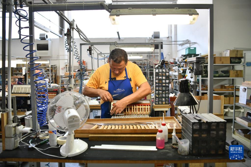 5月29日,在意大利卡斯特尔菲达多,贝尔杜纳品牌手风琴工匠组装手风琴。