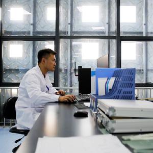 6月13日,工作人员在江苏射阳港零碳产业园的海上风电复合材料检测中心收集、分析测试数据。