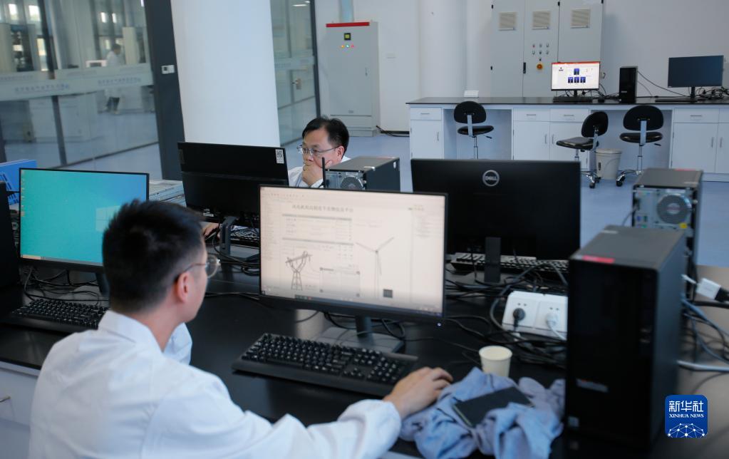 在江苏射阳港零碳产业园,工作人员在海上风电大功率装备研发中心收集数据(6月13日摄)。