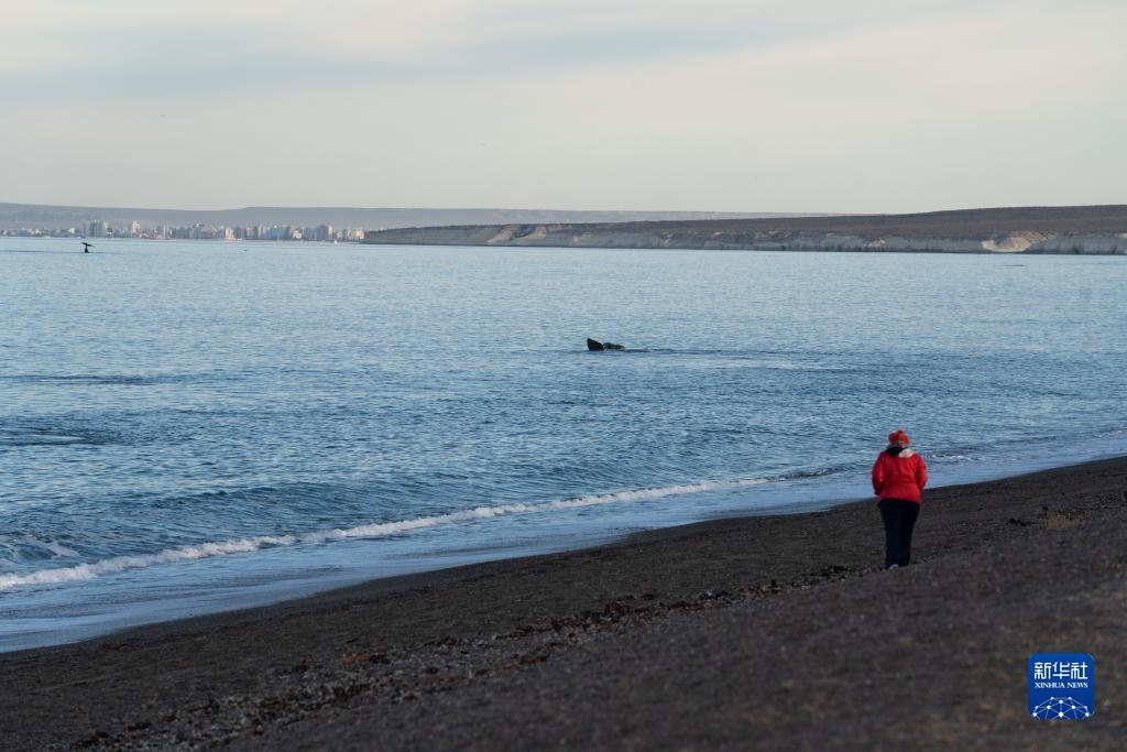 6月13日,在阿根廷马德林港,游客在海滩上观赏南露脊鲸。