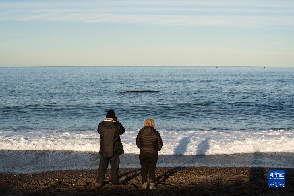 6月13日,在阿根廷马德林港,游客在海滩上观赏南露脊鲸。