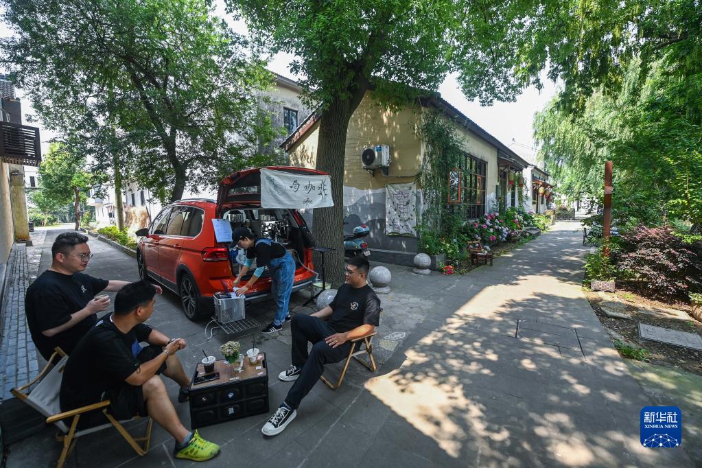 6月14日,游客在织里镇庙兜村的民宿旁喝咖啡、休憩。