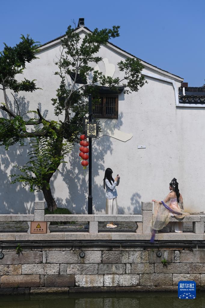 6月14日,身着传统服饰的游客在织里镇义皋古村落拍照留影。