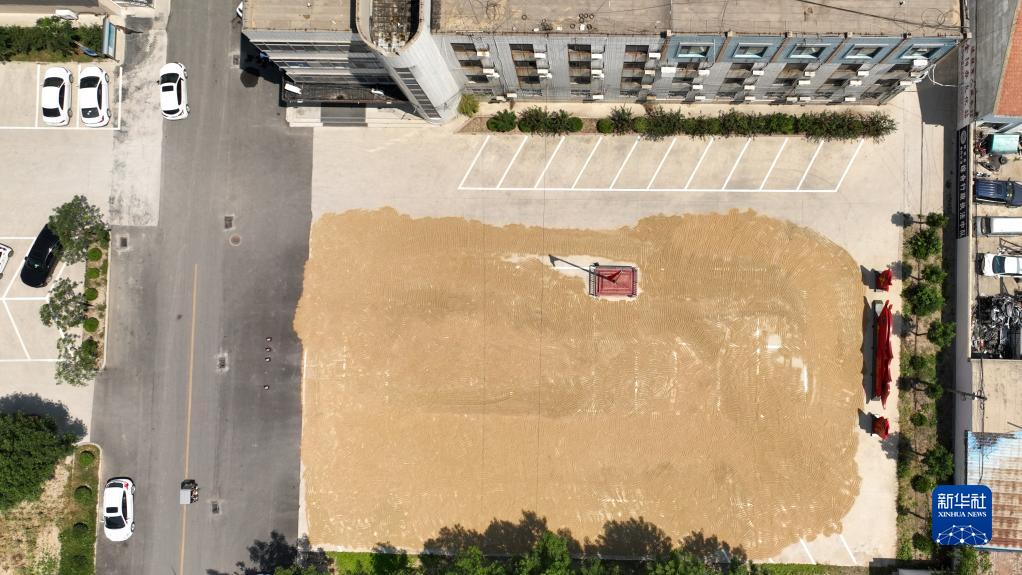 这是在阳信县金阳街道办事处办公楼前晾晒的小麦(6月13日摄,无人机照片)。