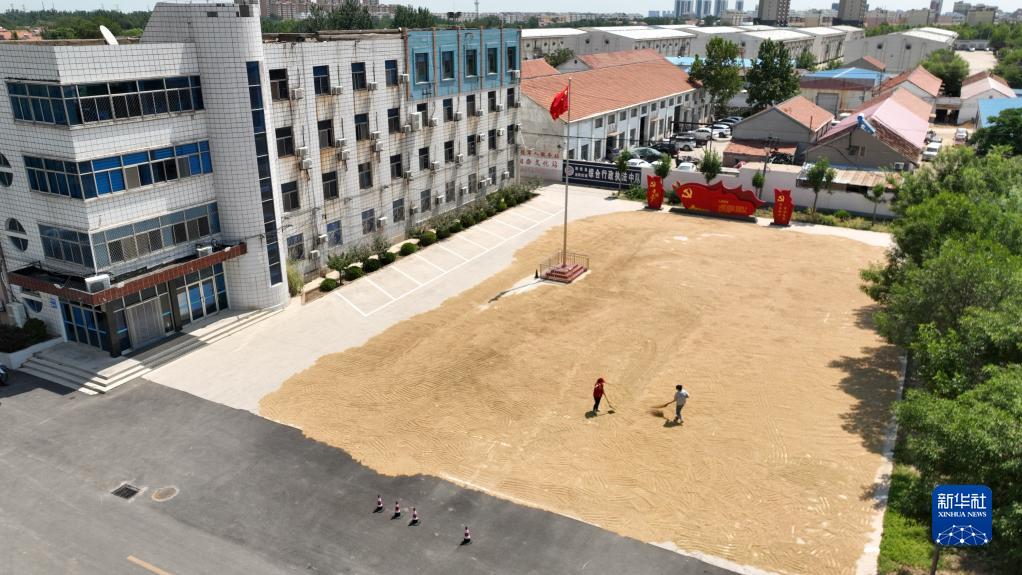6月13日,村民在阳信县金阳街道办事处办公楼前晾晒小麦(无人机照片)。