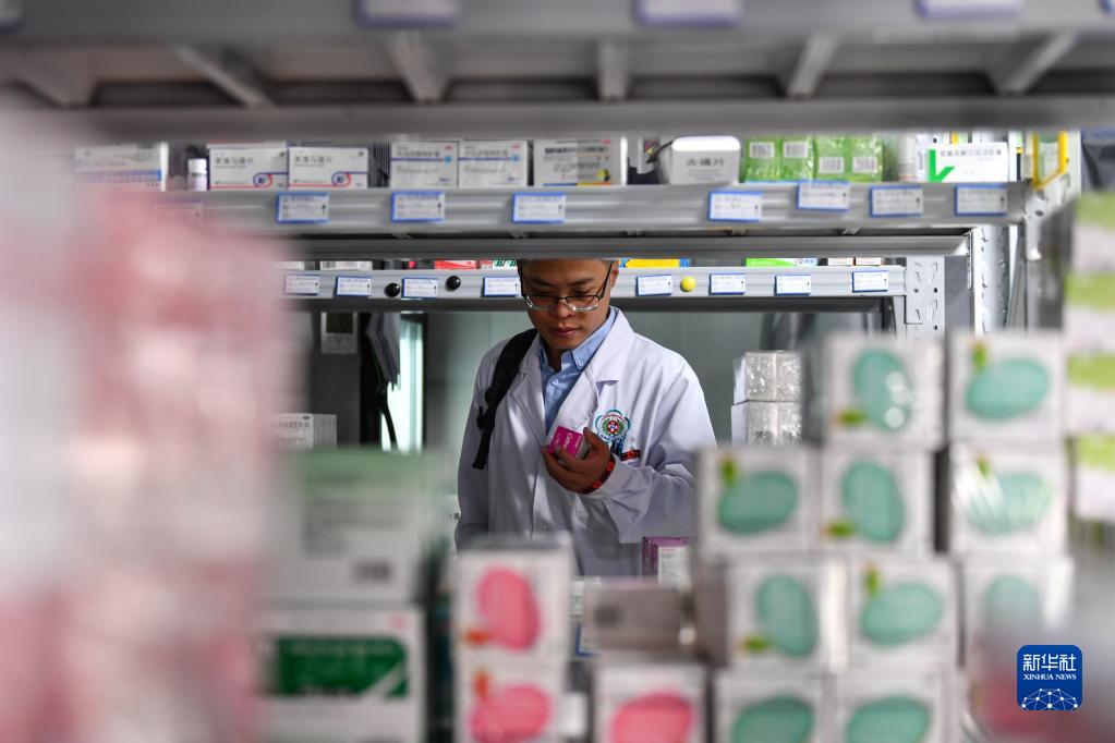 6月12日出发前,王振疆医生在米林市人民医院库房领取药品。