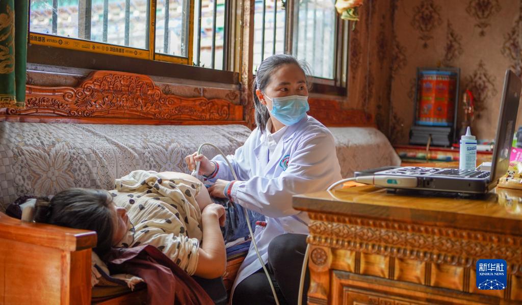 6月12日,陈冰医生(右一)在给产妇扎西央宗做产检。