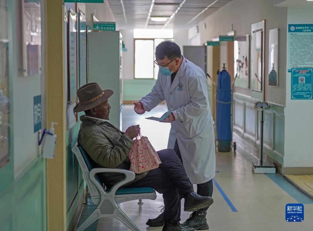 6月12日,王彤旭医生在米林市人民医院走廊里询问患者病情恢复情况。