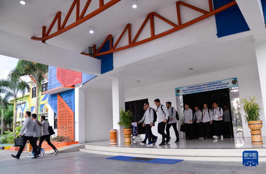 6月7日,在位于印度尼西亚茉莉芬市的印尼铁路理工学院,雅万高铁动车组司机培训班学员走出教学楼。