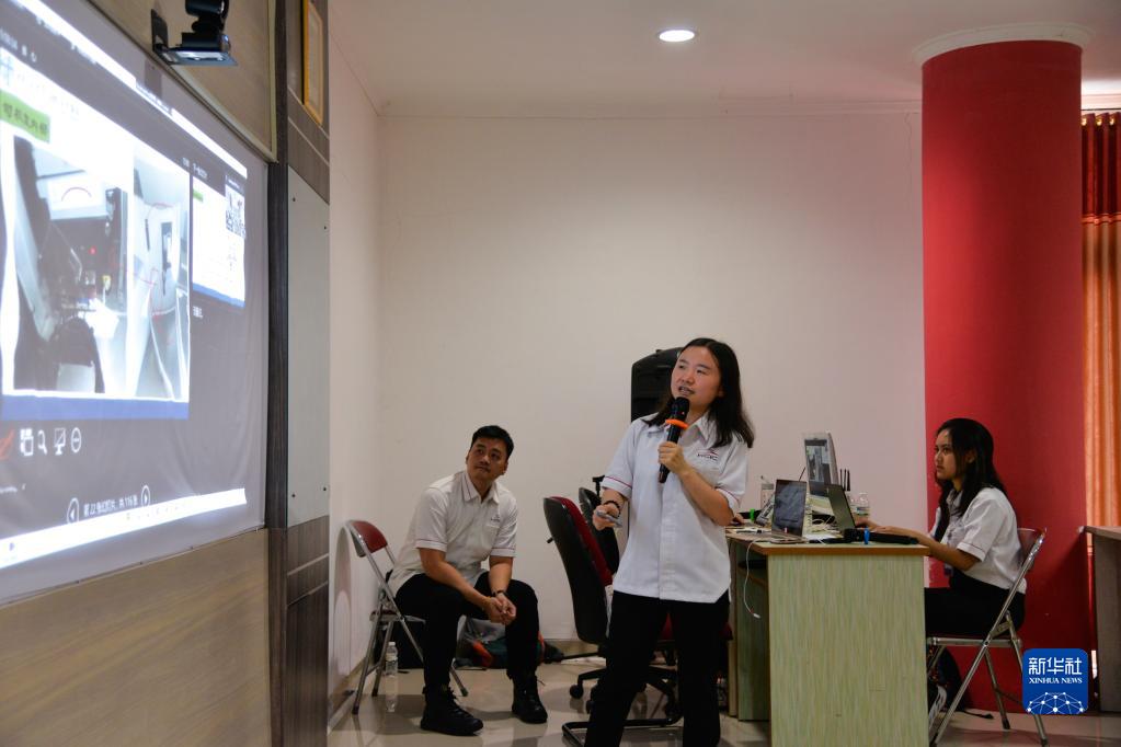 3月20日,在位于印度尼西亚茉莉芬市的印尼铁路理工学院,中国员工刘淑媛(中)在雅万高铁首批运维人员培训班上担任翻译。
