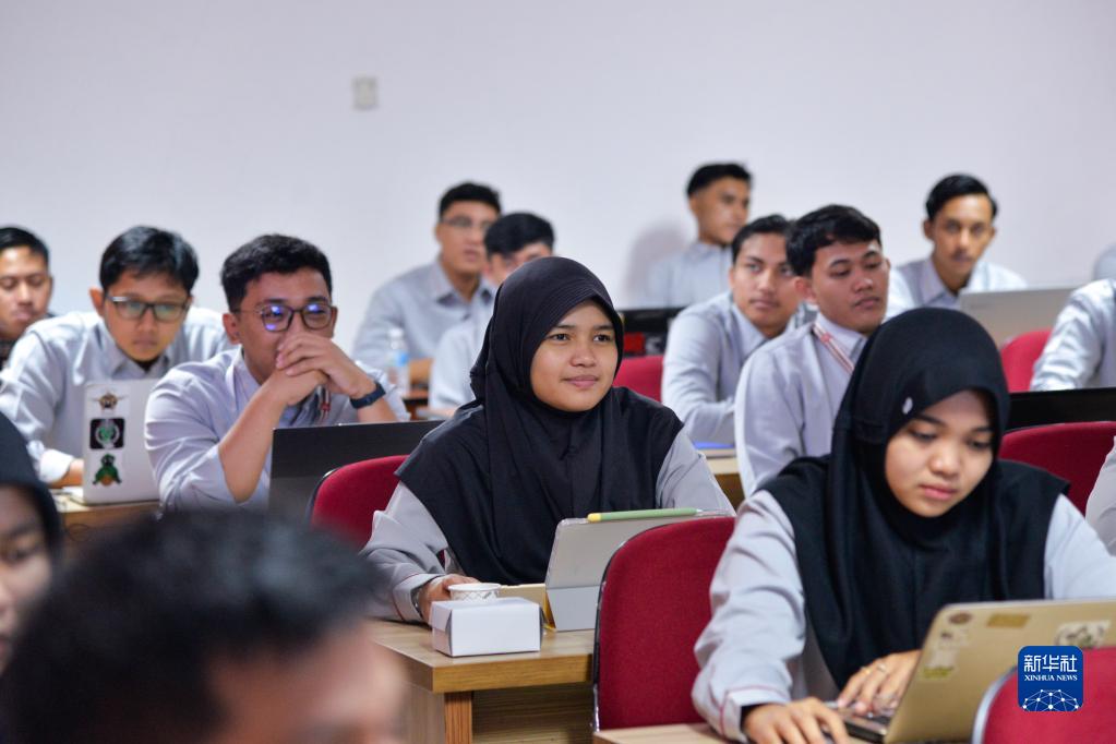 6月7日,在位于印度尼西亚茉莉芬市的印尼铁路理工学院,应急值守人员培训班学员尼斯丽娜(中)参加培训。
