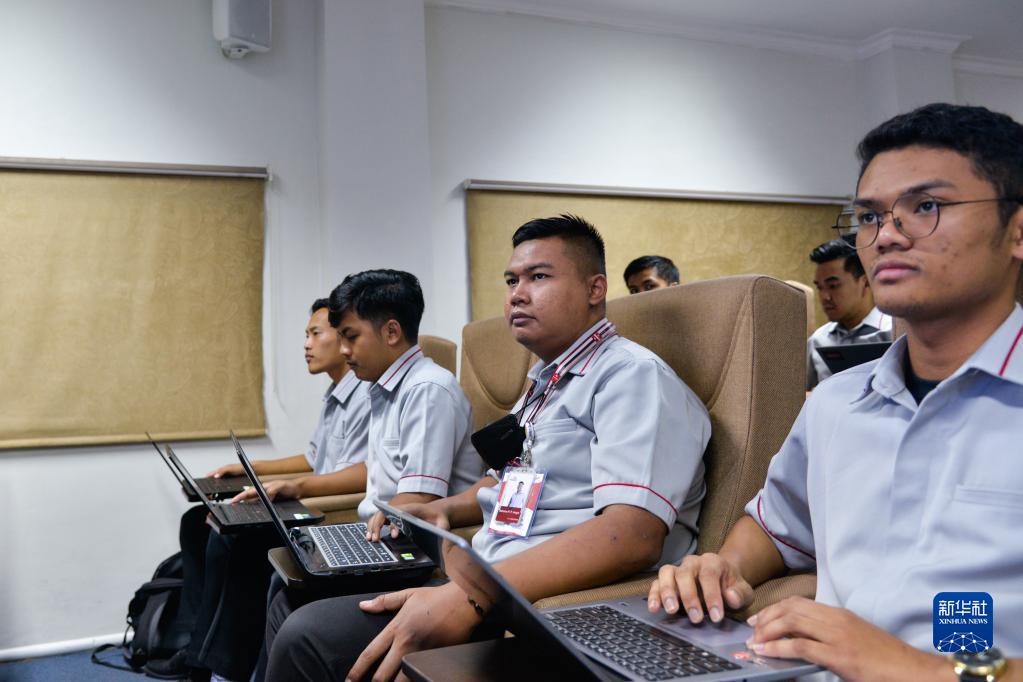 6月7日,在位于印度尼西亚茉莉芬市的印尼铁路理工学院,动车组机械师培训班学员巴哈纳(前右二)参加培训。