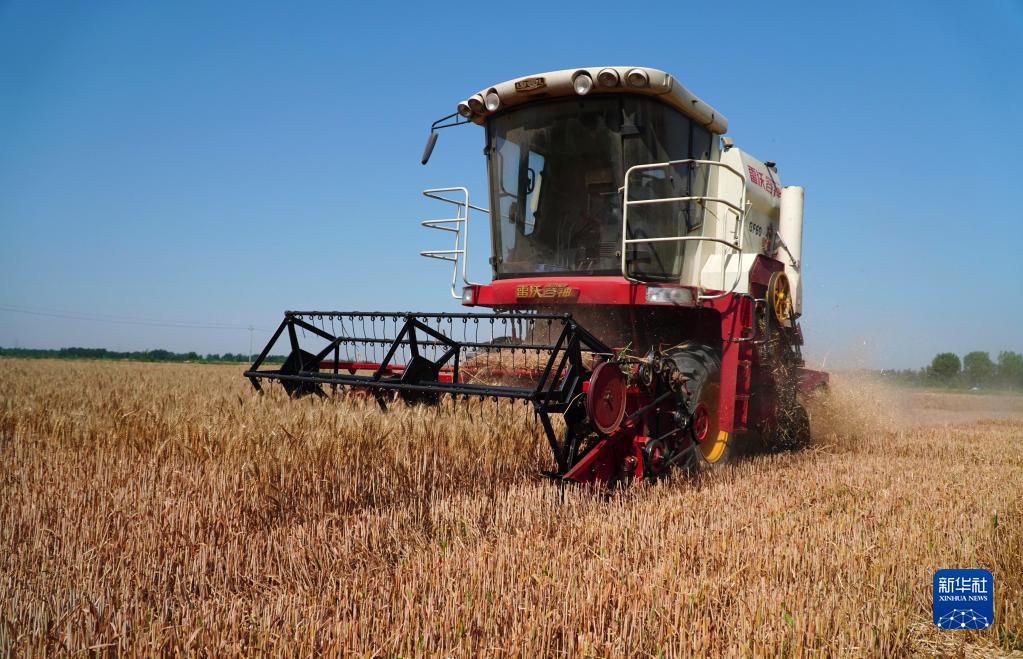 6月14日,在山东省临邑县林子镇,联合收割机在收获小麦。