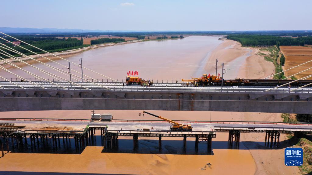 6月14日,在济郑高铁山东段长清黄河特大桥,中铁十局的工作人员进行铁轨铺设作业(无人机照片)。