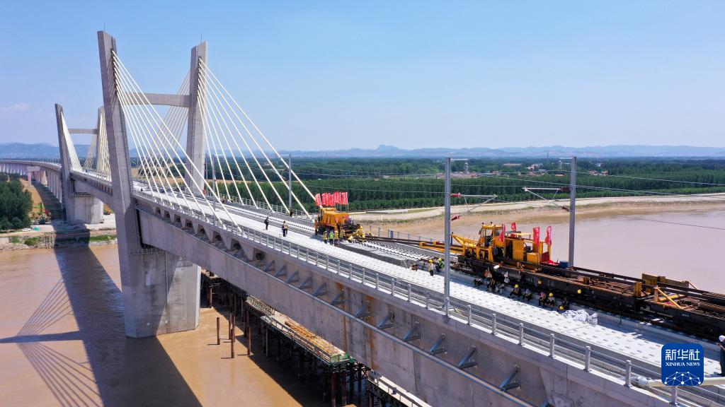 6月14日,在济郑高铁山东段长清黄河特大桥,中铁十局的工作人员进行铁轨铺设作业(无人机照片)。