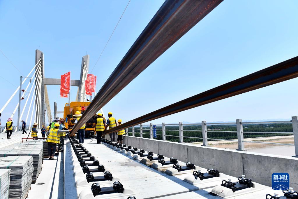 6月14日,在济郑高铁山东段长清黄河特大桥,中铁十局的工作人员进行铁轨铺设作业。