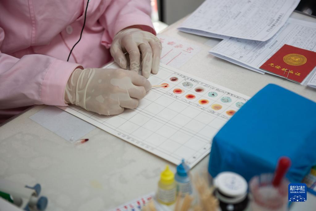 6月14日,在宁夏银川市新华街爱心献血车内,医务人员为献血者进行血样检测。
