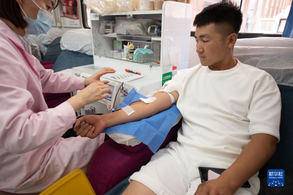 6月14日,市民在宁夏银川市新华街爱心献血车内献血。