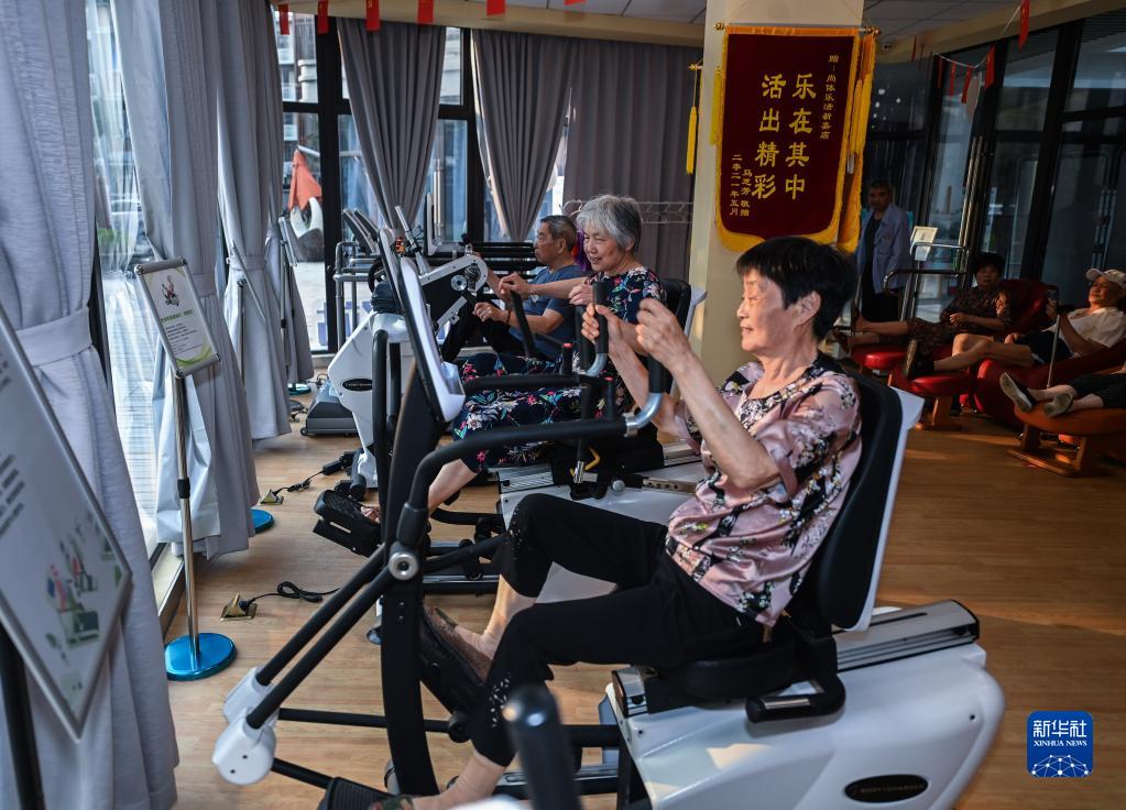 6月14日,在嘉兴市南湖区新嘉街道电子社区邻里中心的长者运动健康之家内,老人们在进行器械锻炼。