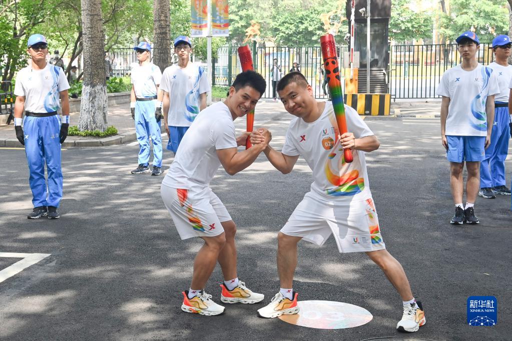 6月15日,火炬手钟齐鑫(前左)与郭子平在火炬传递中交接。