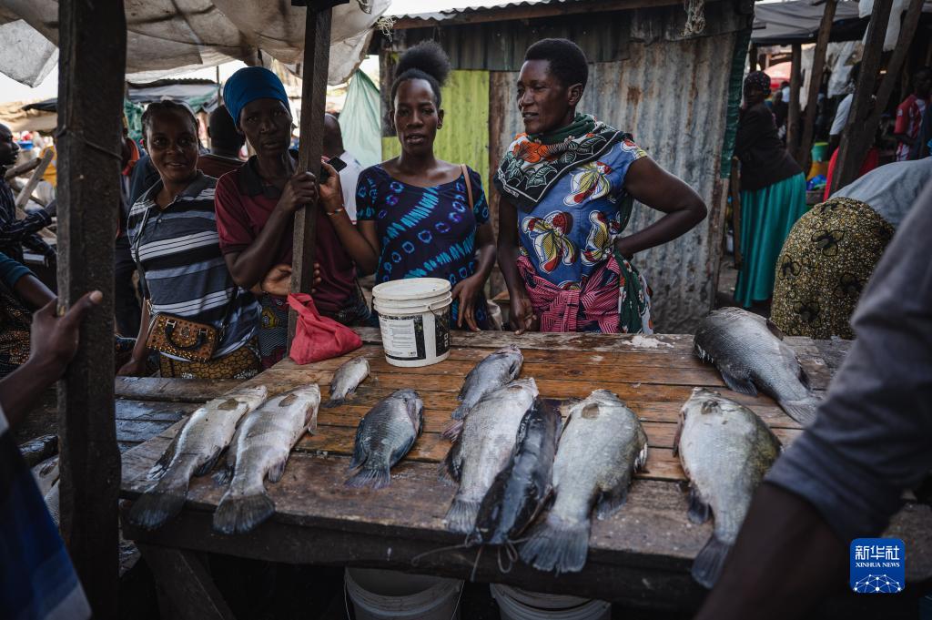 6月11日,人们在坦桑尼亚姆万扎省维多利亚湖畔附近卖鱼。
